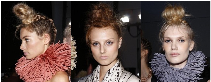 Объемный пучок волос с высоким начесом на макушке - хит 2011 года. В прическе должа быть такая же небрежность и немного романтичность. Для стильного образа не нужно приглаживать волосы, а оставшийся от пучка хвостик желательно оставить распущенным.